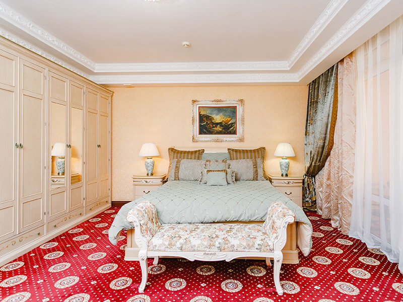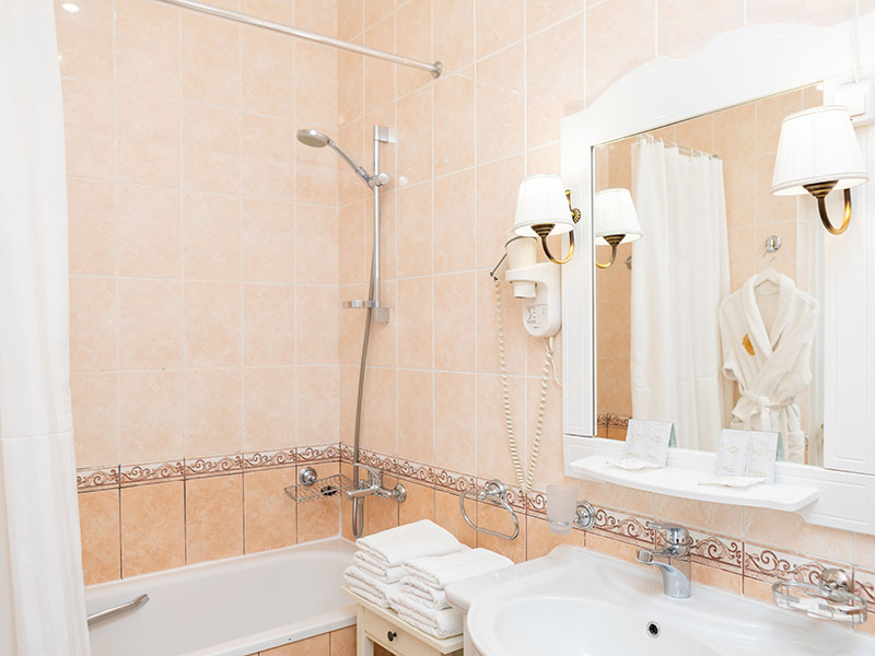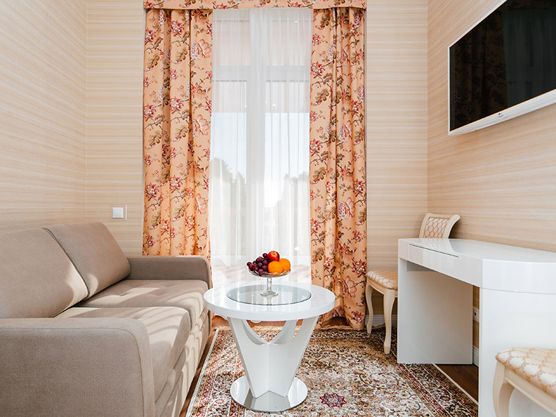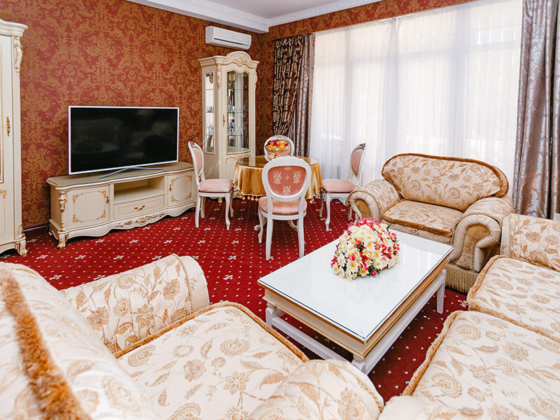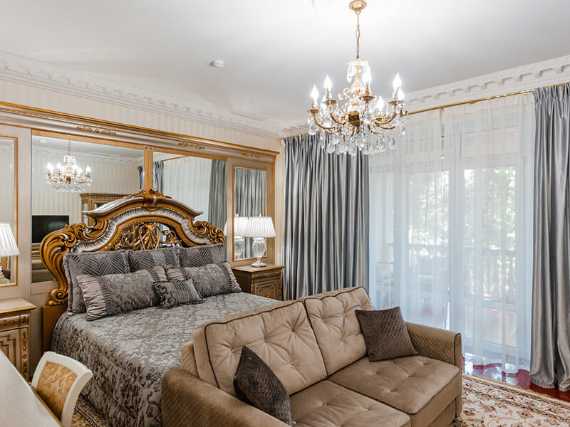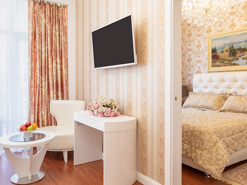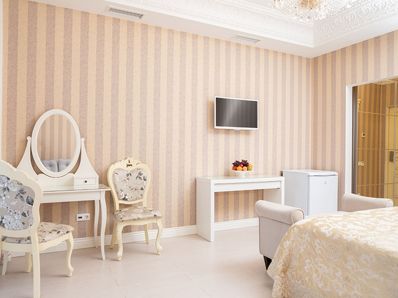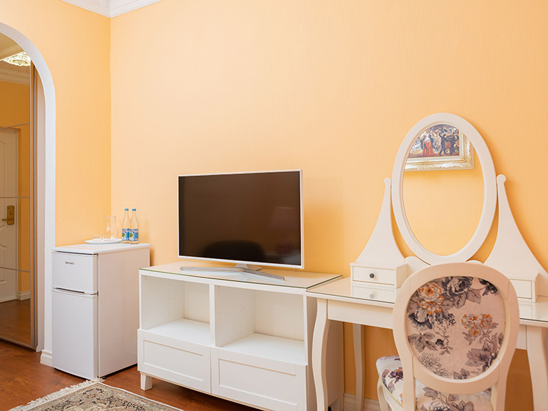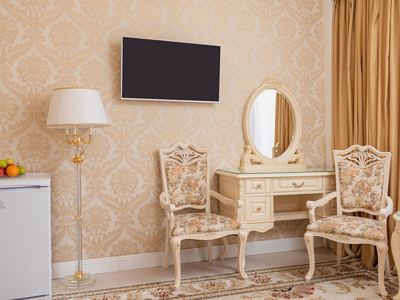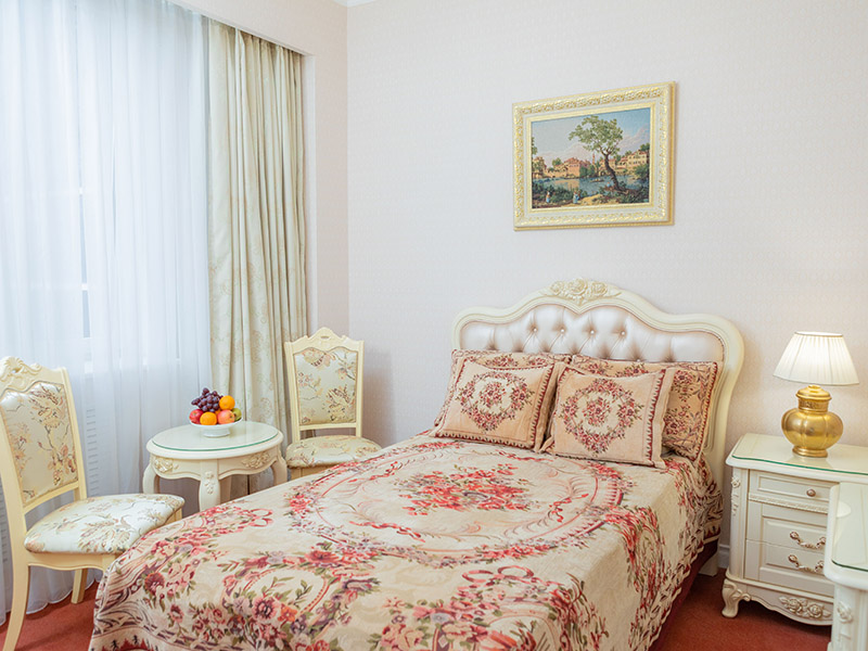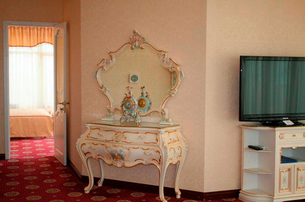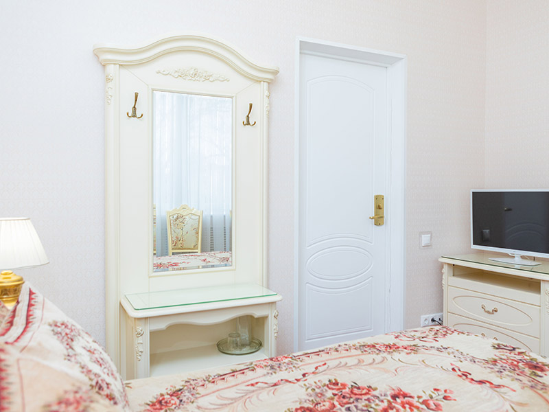В номере: основная комната с большой кроватью, бельевым шкафом, трюмо, тумбами с бра, софой, трюмо. Есть климатическая система, плазменный телевизор и мини-холодильник. Классический дизайн поддержан красивыми световыми приборами. Ванная комната: душевая кабинка, фен и банные принадлежности.