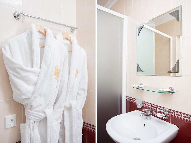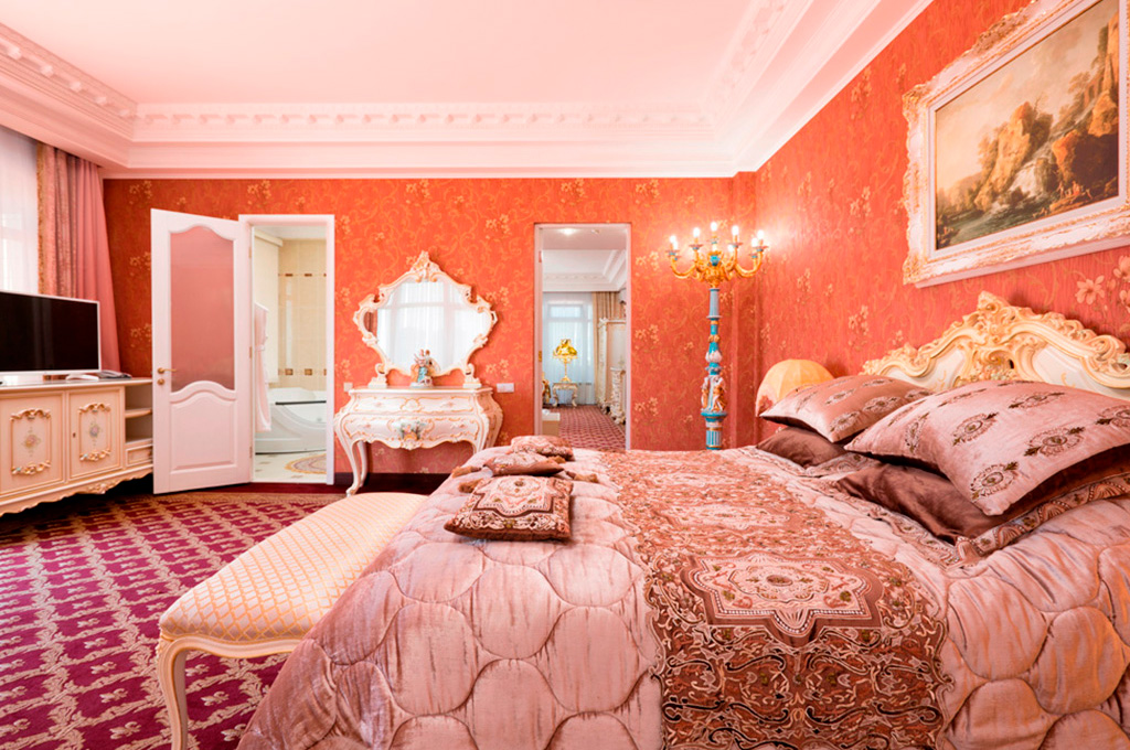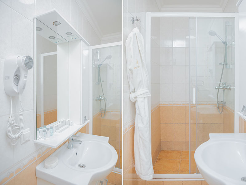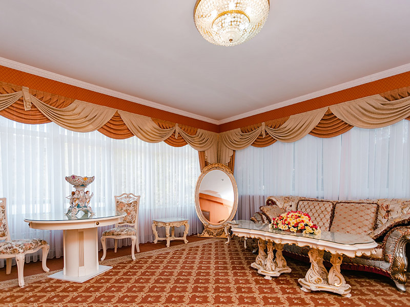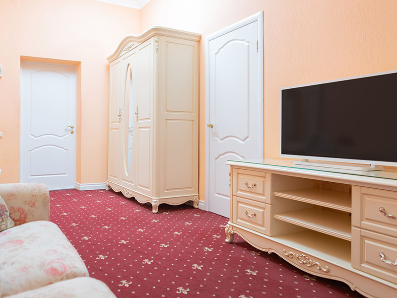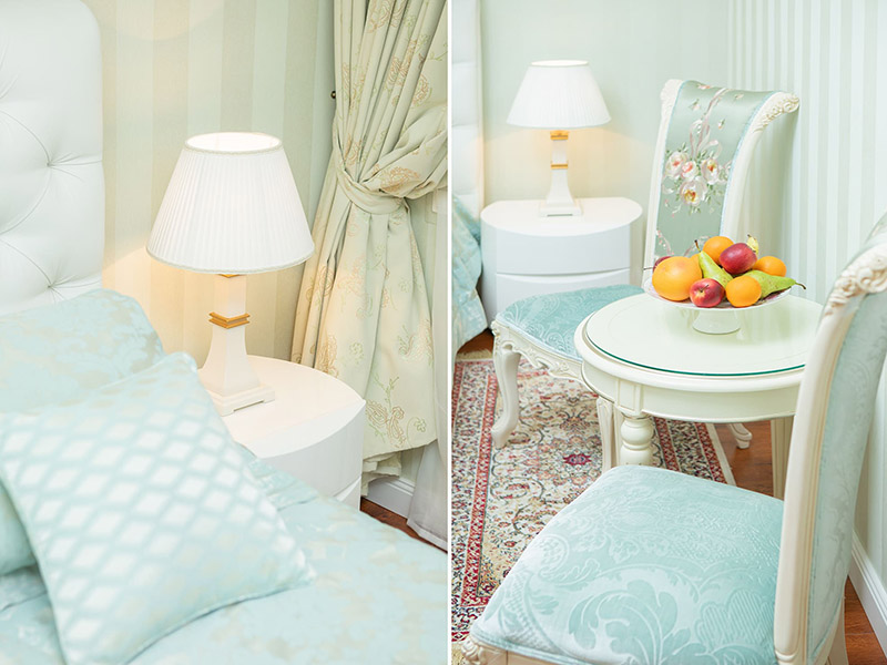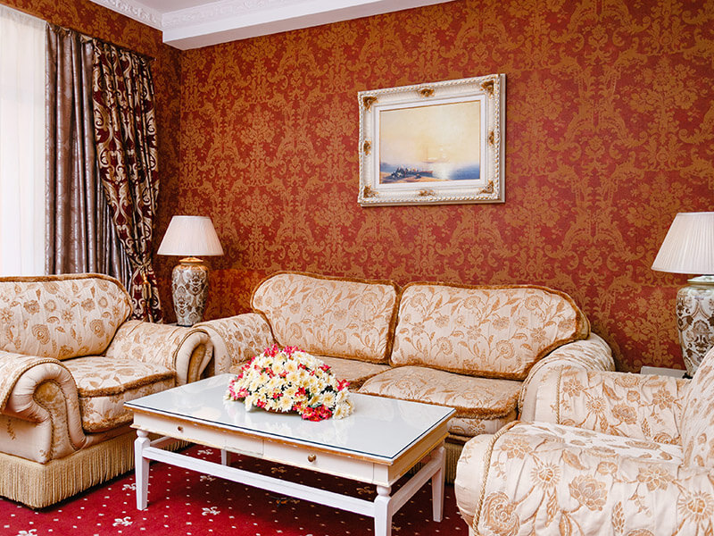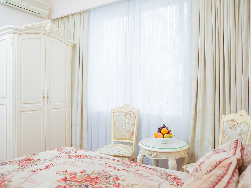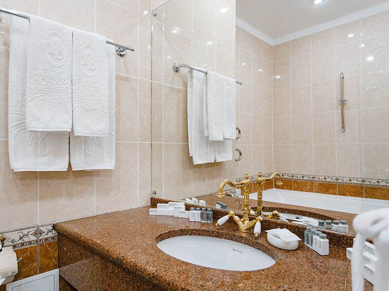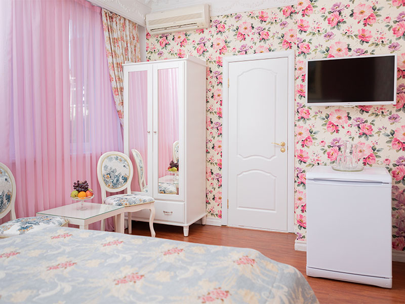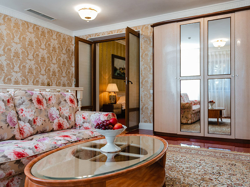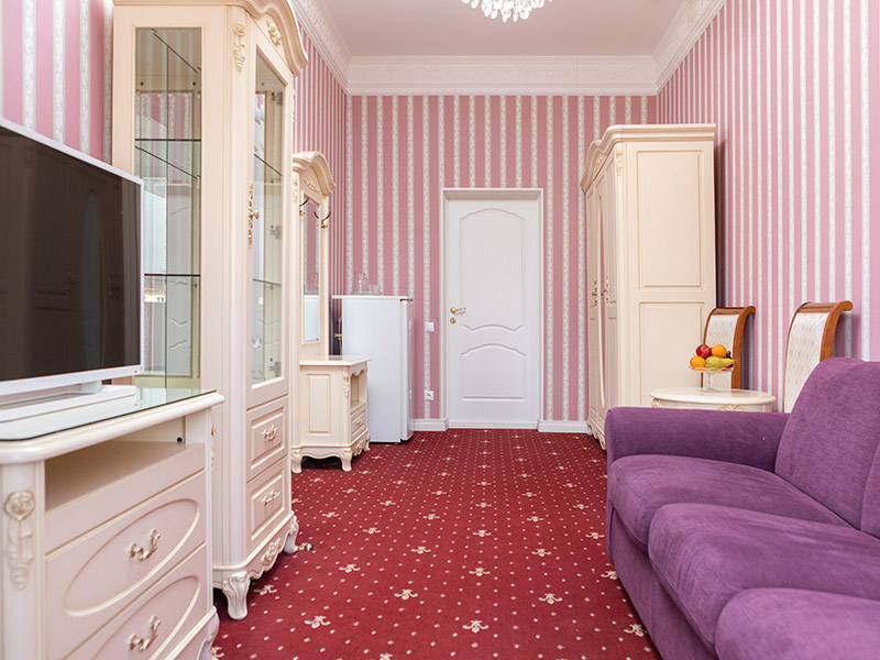 В номере: основная комната с большой кроватью, бельевым шкафом, трюмо, тумбами с бра, софой, трюмо. Есть климатическая система, плазменный телевизор и мини-холодильник. Классический дизайн поддержан красивыми световыми приборами. Ванная комната: душевая кабинка, фен и банные принадлежности.