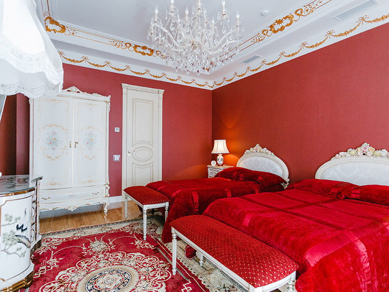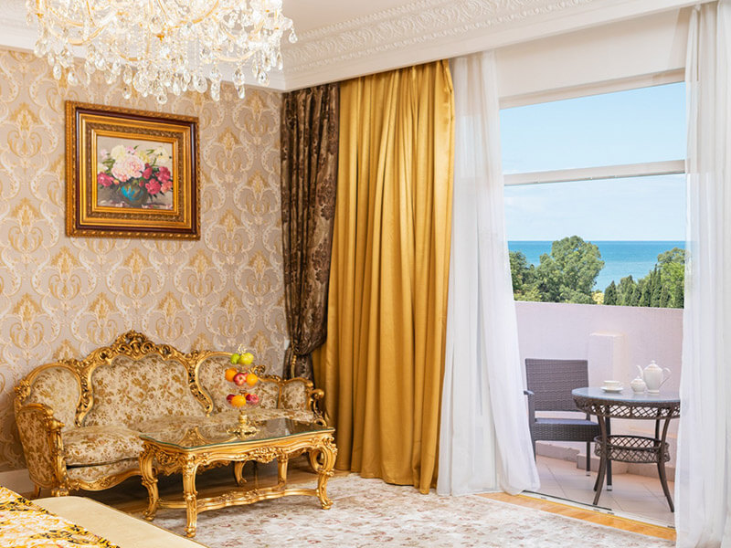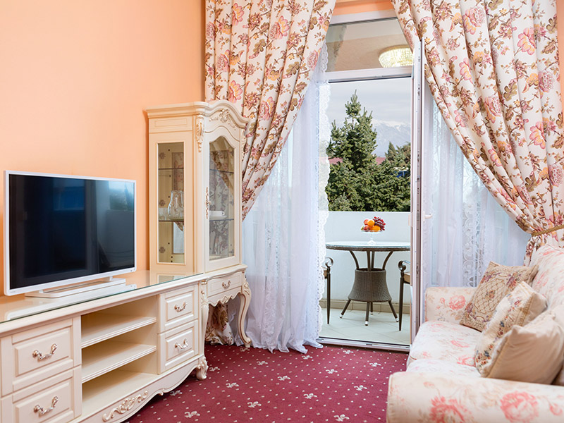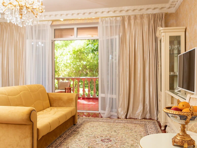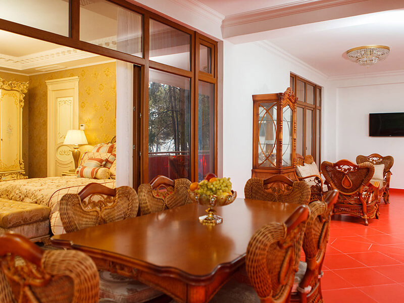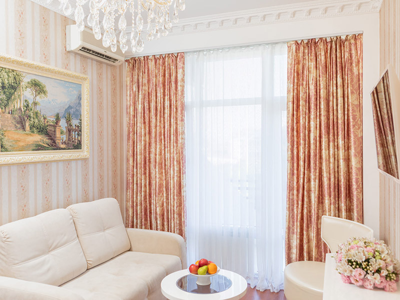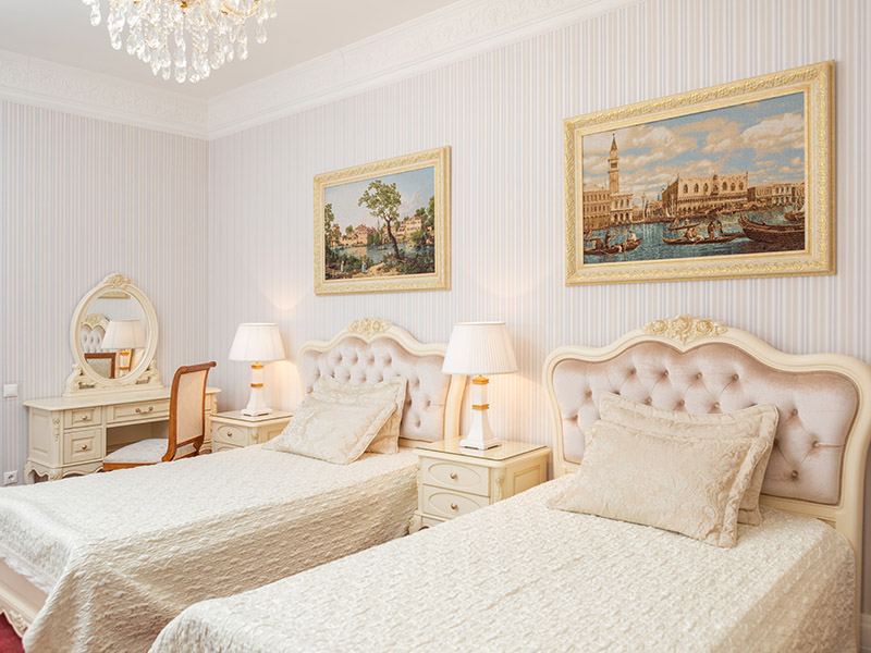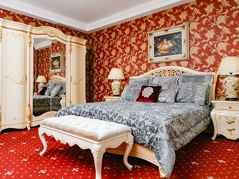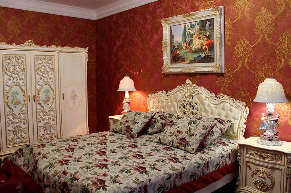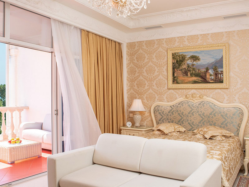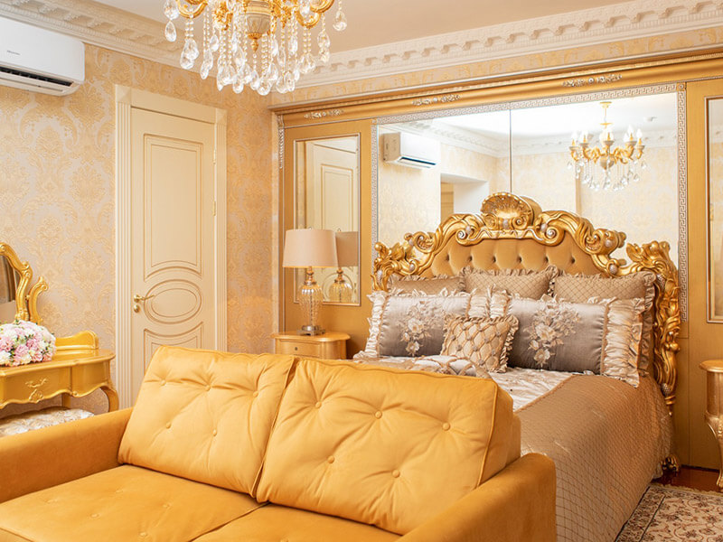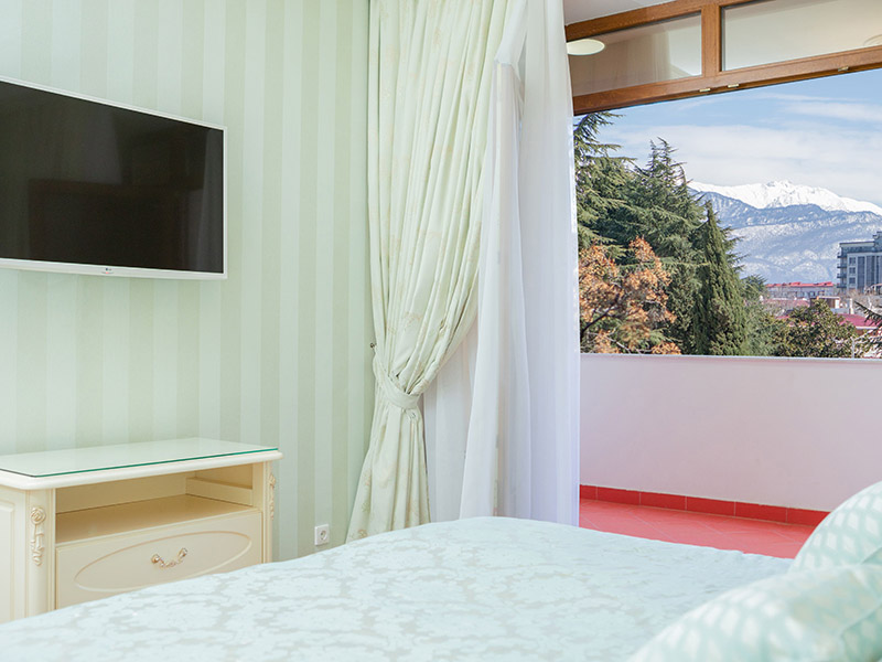 В номере: основная комната с большой кроватью, бельевым шкафом, трюмо, тумбами с бра, софой, трюмо. Есть климатическая система, плазменный телевизор и мини-холодильник. Классический дизайн поддержан красивыми световыми приборами. Ванная комната: душевая кабинка, фен и банные принадлежности.