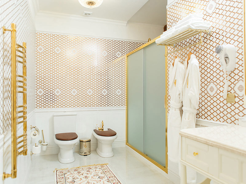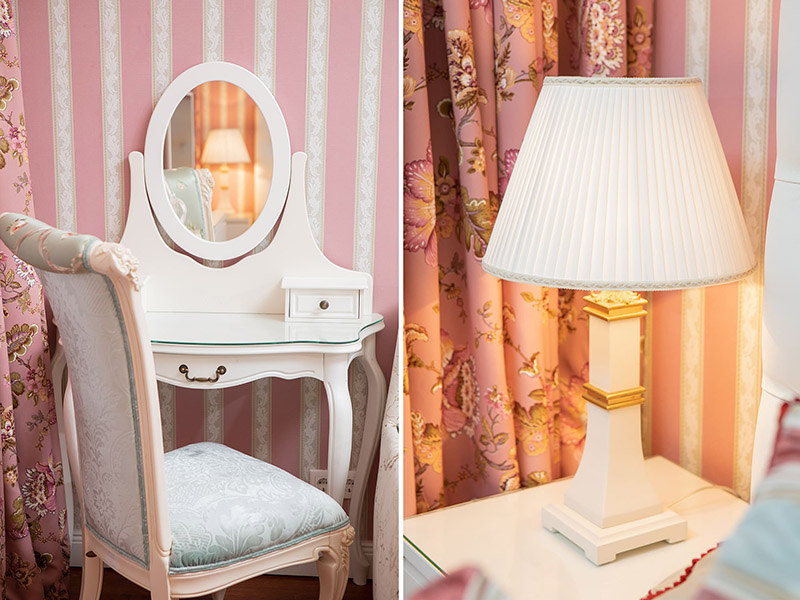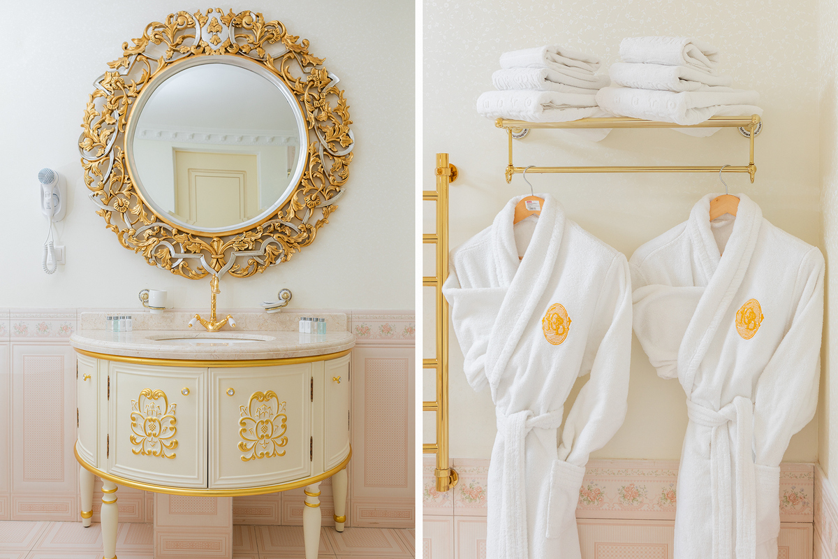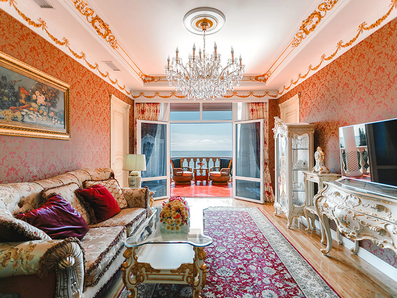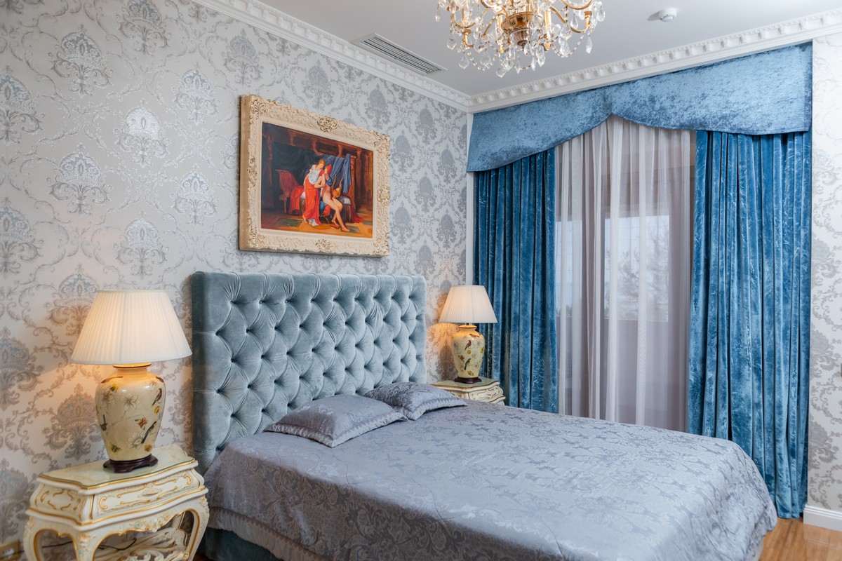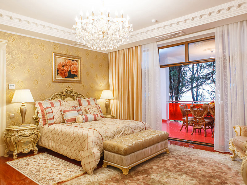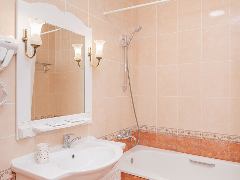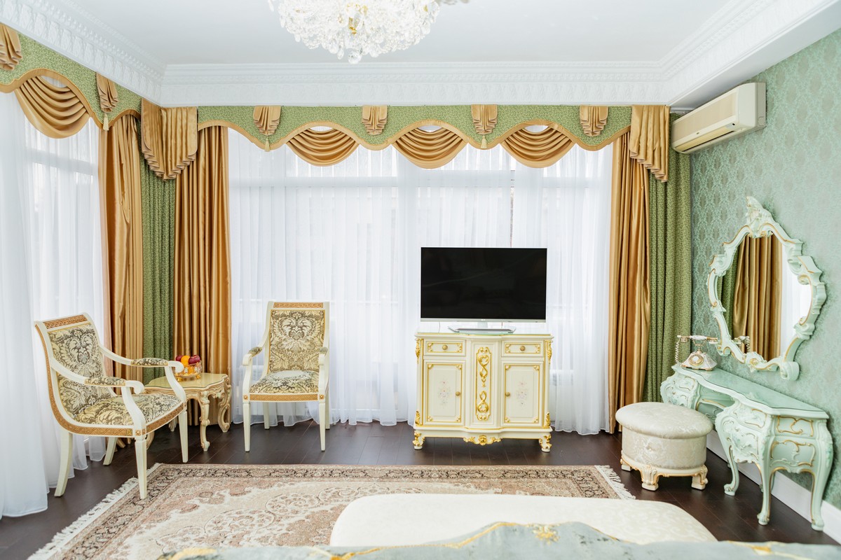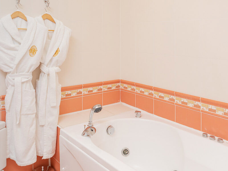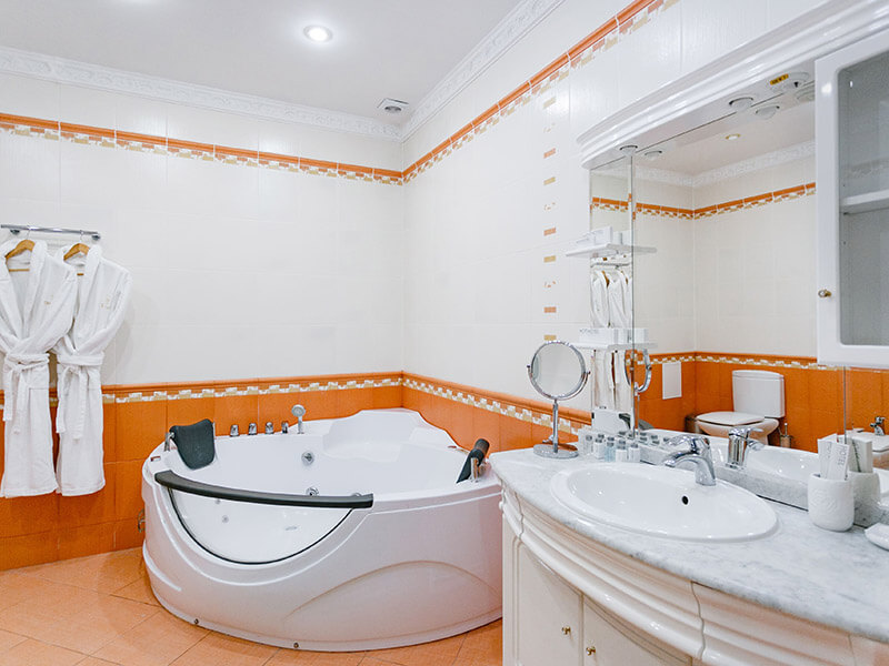 В номере: основная комната с большой кроватью, бельевым шкафом, трюмо, тумбами с бра, софой, трюмо. Есть климатическая система, плазменный телевизор и мини-холодильник. Классический дизайн поддержан красивыми световыми приборами. Ванная комната: душевая кабинка, фен и банные принадлежности.