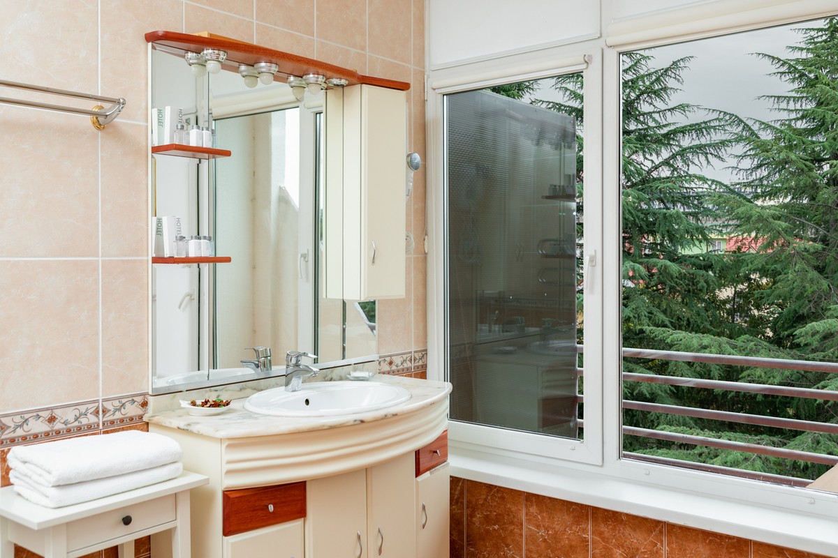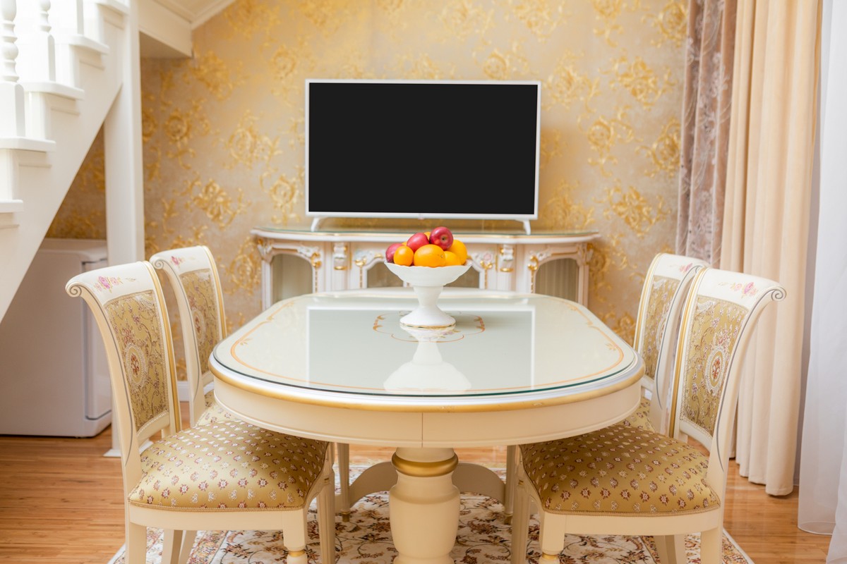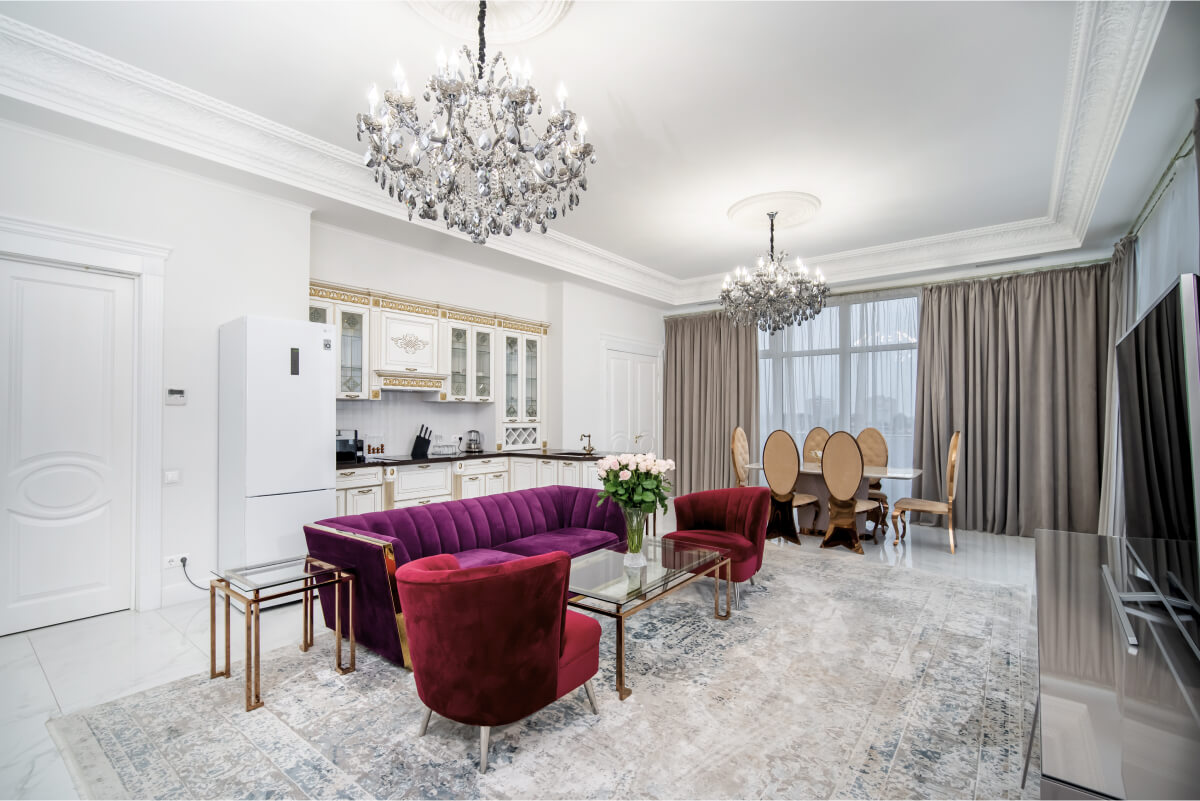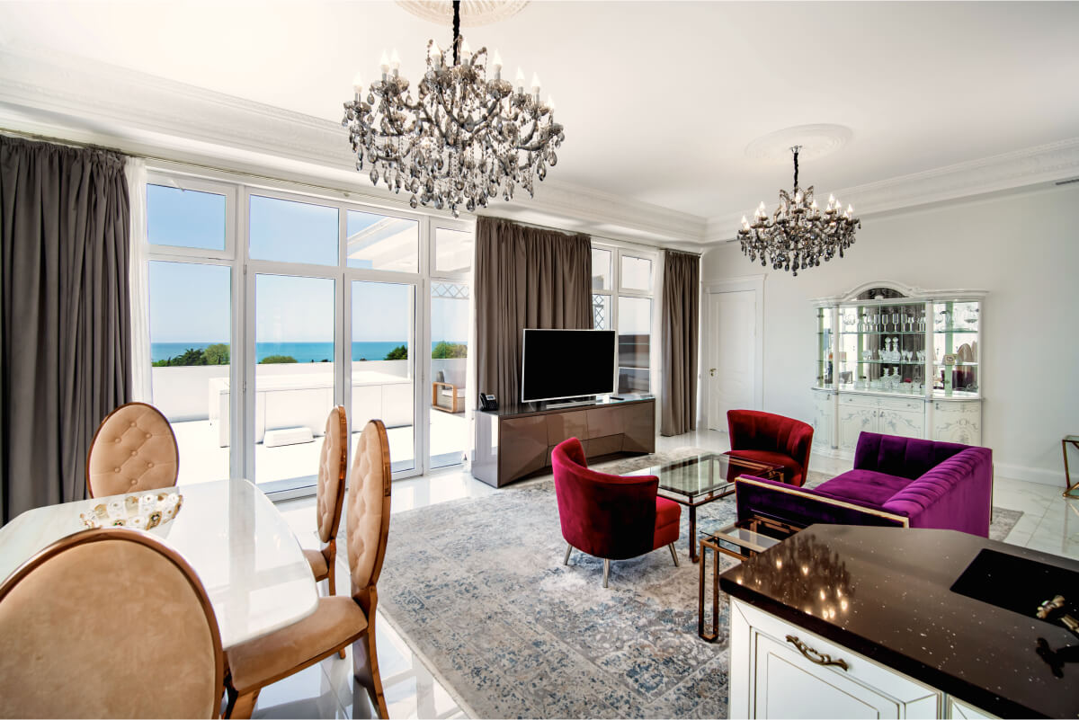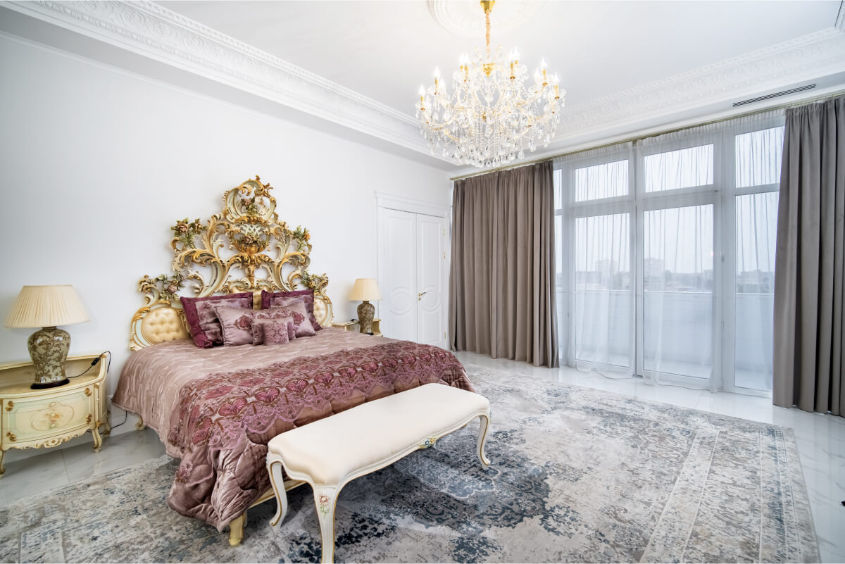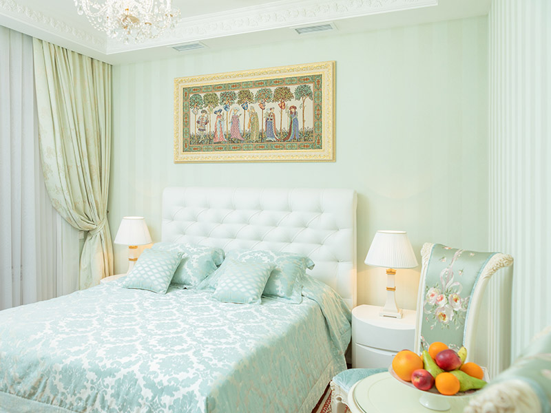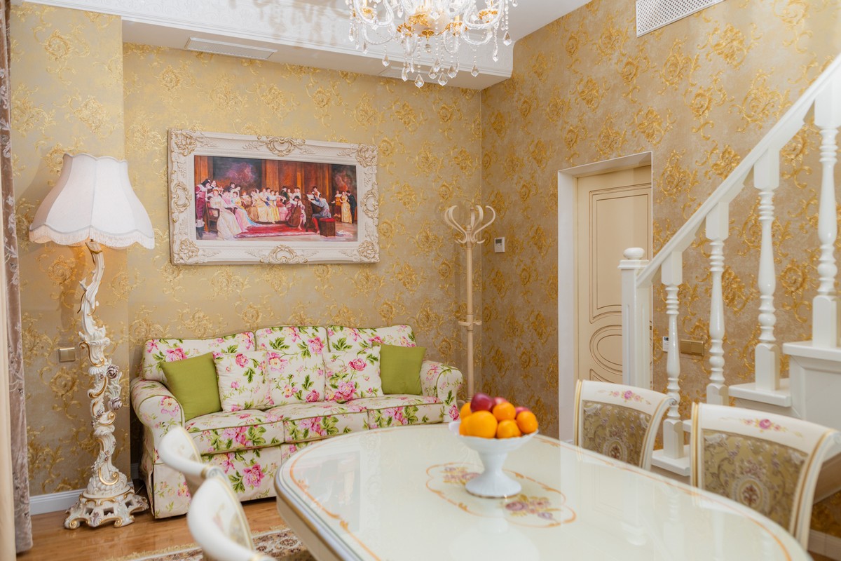 В номере: основная комната с большой кроватью, бельевым шкафом, трюмо, тумбами с бра, софой, трюмо. Есть климатическая система, плазменный телевизор и мини-холодильник. Классический дизайн поддержан красивыми световыми приборами. Ванная комната: душевая кабинка, фен и банные принадлежности.